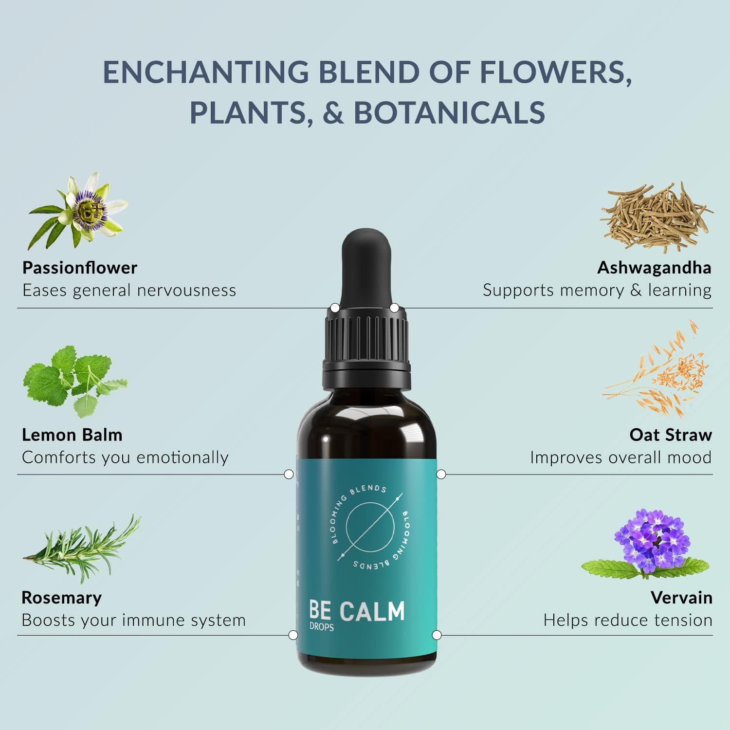 - Nature's Magic at Its Best: Discover your plant power with the six nourishing botanicals of our stress support tincture. Now you can break free from all the worries that put you on edge with Blooming Blends.