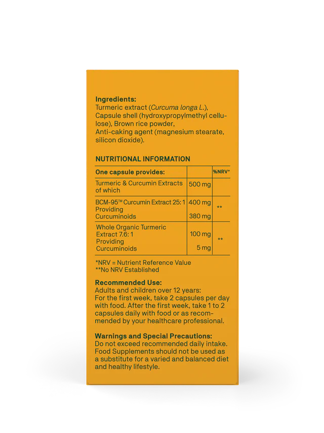 Turmeric extract (Curcumalonga L.), Capsule shell (hydroxypropylmethylcellulose), Brown rice powder, Anti-cakingagent (magnesium stearate, silicon dioxide).