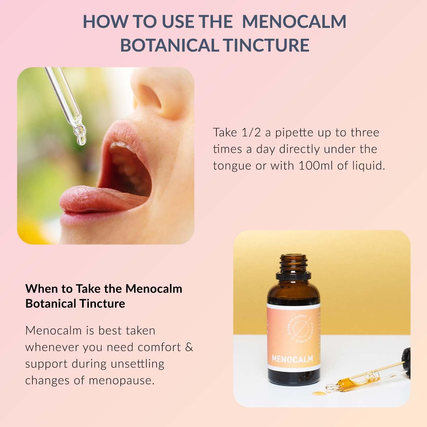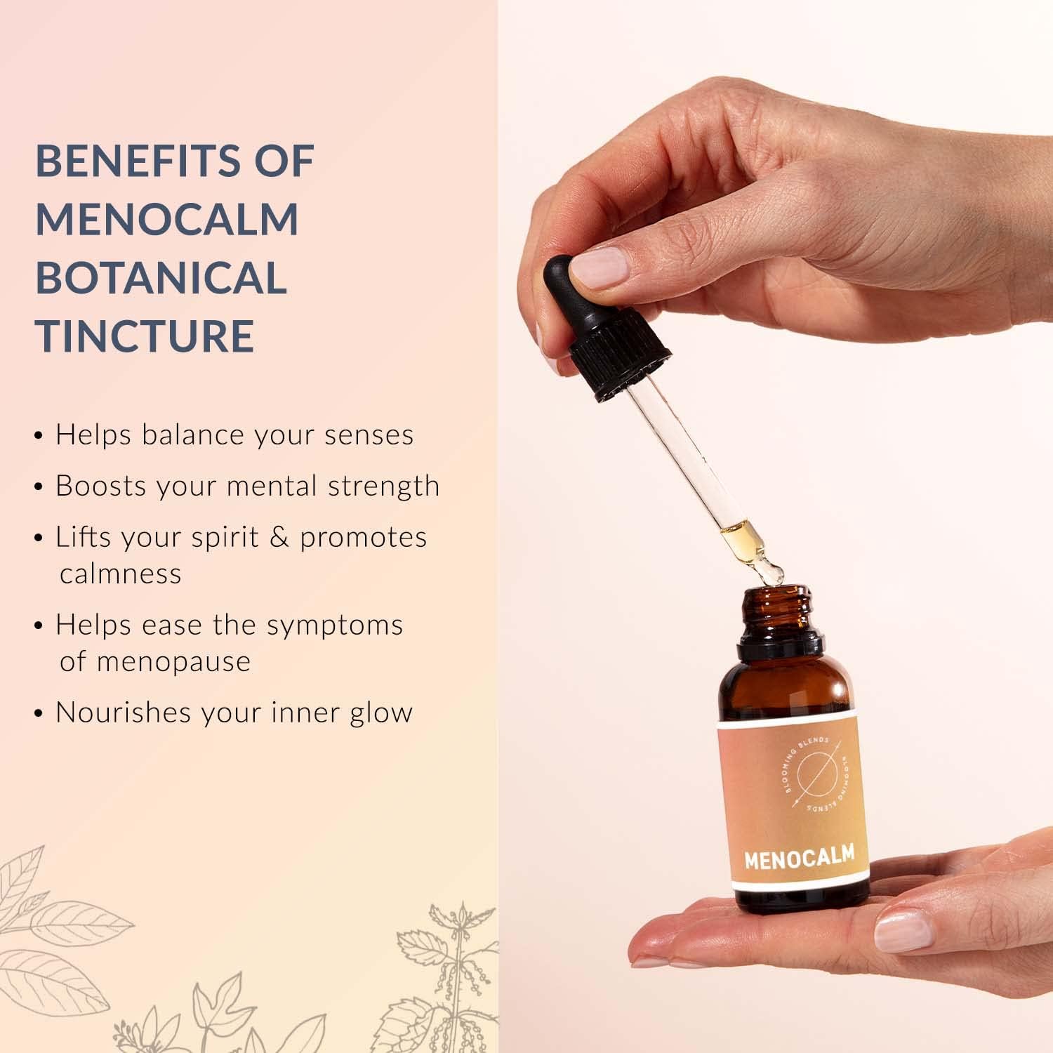 An all-natural herbal drops to reduce multiple menopause symptoms. You should enjoy your golden journey. Our menopause relief tincture helps nourish your body. SUPPORT ON YOUR GOLDEN JOURNEY Have a balanced menopausal change with our menopause relief tincture with sage leaf extract that channels nature's magic at its best to nourish your mind & body in this momentous point of your womanhood. The packaging of our menopause support tincture is very portable and easily fits inside your purse. YOUR GENTLE RELIEF AT HAND Easy to bring anywhere, our menopause support tincture provides you with a soothing relief whenever you need it. Unlike other supplements & hard-to-swallow tablets, our passiflora drops are delicious & easy to take. Feel more alive on your golden age. Our calm supplement tincture provides support on your journey. FEEL MORE ALIVE & INVIGORATED Let our calm supplement tincture give you the much-needed support to cope up with your menopausal journey. Each drop of our passionflower extract tincture combats mood swings & even helps you achieve a deeper sleep. Take a half pipette of our rose extract tincture to uplift your spirit and show your inner glow. FEEL CALMER DURING THE STORM This stage in your life can be challenging, but our passiflora tincture is here to support! Let our menopausal herbal drops strengthen your well-being during this phase, so you can fully bloom into a stronger woman. Our menopause supplement for women is vegan, sugar-free, and gluten-free. ALL-NATURAL, NOTHING ARTIFICIAL Each of our tinctures is a blend of six herbs, plants, & flowers extracts that date back to the ancient history of herbal medicine. We only use botanical ingredients, so our tinctures are chemical-free, alcohol-free, vegan, & gluten-free. Our hand-blended menocalm herbal drops are produced in small batches using traditional methods. TRADITIONAL & MODERN TECHNIQUES Inspired by the earliest days of herbal tinctures, we merged the traditional Ethanol extraction & modern Glycerin technique to incorporate the magic of nature in one bottle. Our formula will make your busy life more smooth-sailing, keeping your mind & body always in-tune. This menopause relief tincture are formulated with love and care that supports your golden journey. HAND-BLENDED WITH LOVE & CARE Our passion is to provide you with a harmonious blend of herbal extracts that fortifies the mind, body, & spirit. All the way from the nature-loving town of Cheltenham, our tinctures are hand-blended in small batches to channel the essence of nature. The sage leaf extract helps lower the severity of menopausal symptoms. VARIETY OF BLENDS FOR YOUR NEEDS Our herbal tinctures come in a variety of blends that match your needs. Whether it’s for energising the body, building self-confidence, achieving better sleep, strengthening the immune system, or elevating your mood, there is a delicious tincture for you. Don't let the symptoms of menopause bother you! Take a half pipette of tincture to show your beauty Stay young & glowing using our glycerine liquid tincture to promote calmness.   Our Menocalm Blend contains red clover, sage, & passionflower to help manage menstrual symptoms.